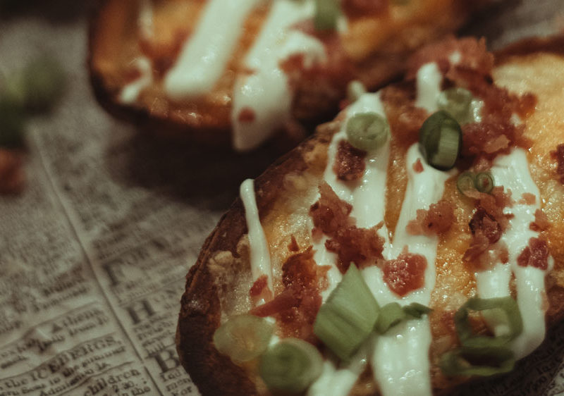 BAKED POTATO SKINS 9.5 BAKED POTATO SKINS 9.5Crispy baked potato skins with melty cheese, smoked bacon, topped with sour cream and green onions.